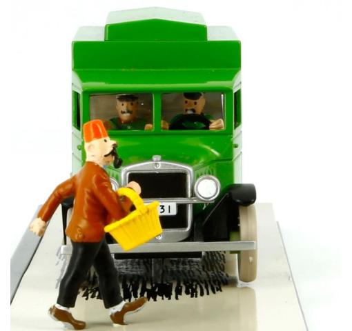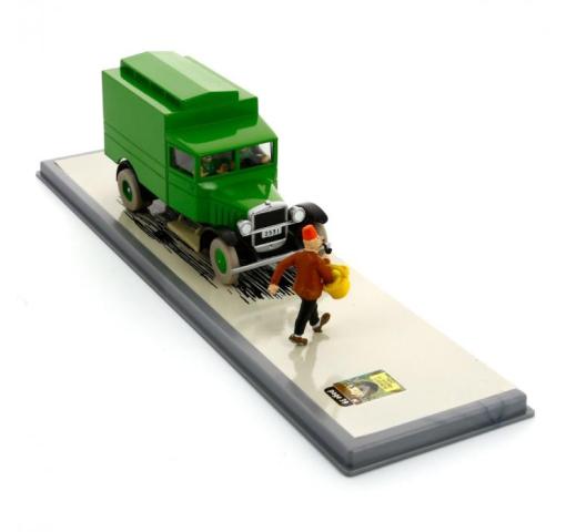 Collectible car, 1/43 scale, model of the prison van from page 39 of King Ottokar's Sceptre comes with a guard, Tintin, Snowy and a pedestrian. The top of the van may be removed to see inside. Original box with booklet.