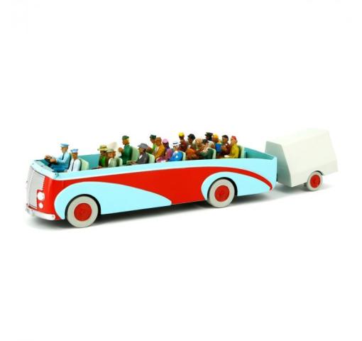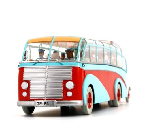 Collectible car, 1/43 scale, model of the Swissair bus from page 45 of the The Calculus Affair (1956) is convertible: the roof can be removed to show the passengers inside. The Swissair bus from the Tintin cars series was created in 2013 as a limited edition of 12,500 copies.